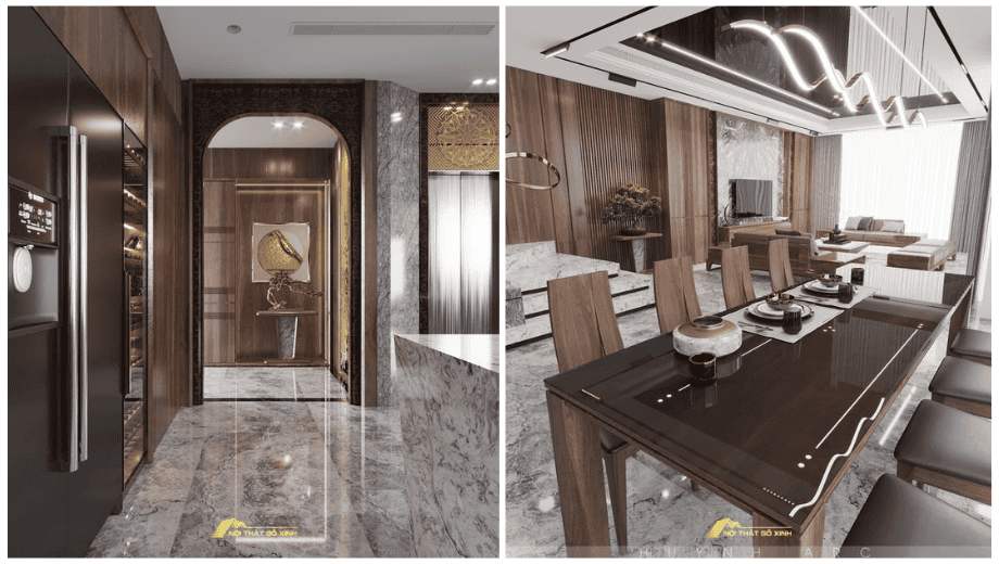 Trong không gian Á Đông, gỗ óc chó thường kết hợp với đá tự nhiên, ánh sáng vàng, chi tiết đồng và nội thất màu trung tính. Điều này tạo nên sự giao thoa tinh tế giữa hiện đại và truyền thống, sang trọng mà vẫn giữ chất thiền định, an yên.