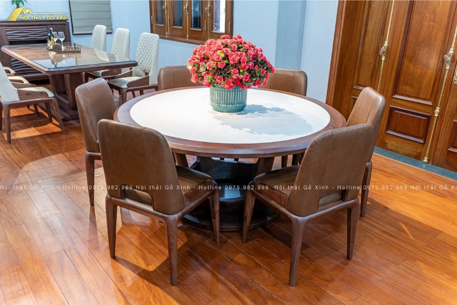 Bộ bàn ăn gỗ óc chó Lumi I bao gồm bộ 6 chiếc ghế Lumi bọc da bò Ý màu nâu sang trọng kèm theo một bàn ăn tròn gỗ óc chó