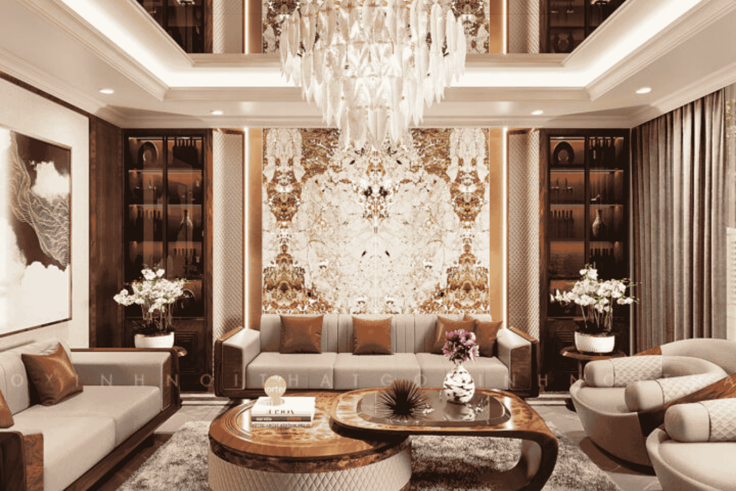 • Khẳng định vị thế cho gia chủ: Chất liệu gỗ óc chó đẳng cấp là lựa chọn tuyệt vời để tạo điểm nhấn cho không gian phòng khách.